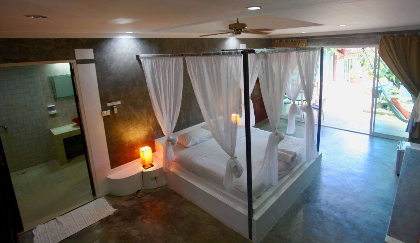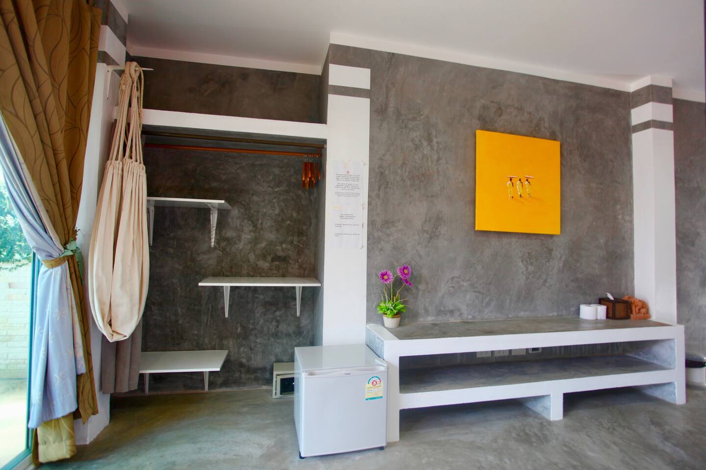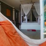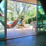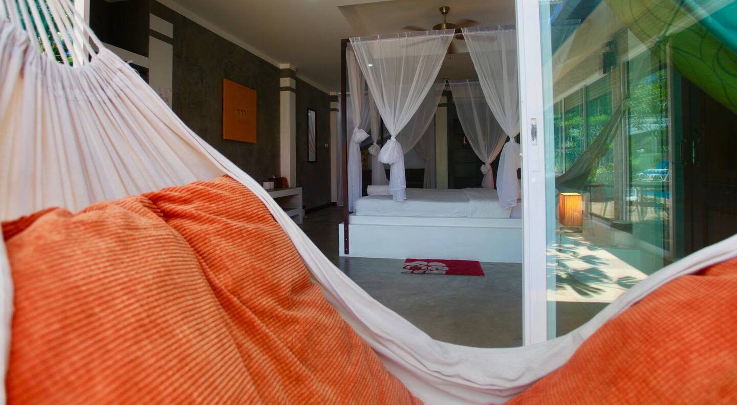 Jedes Zimmer hat seine Terrasse mit Stühlen und Hängematte.