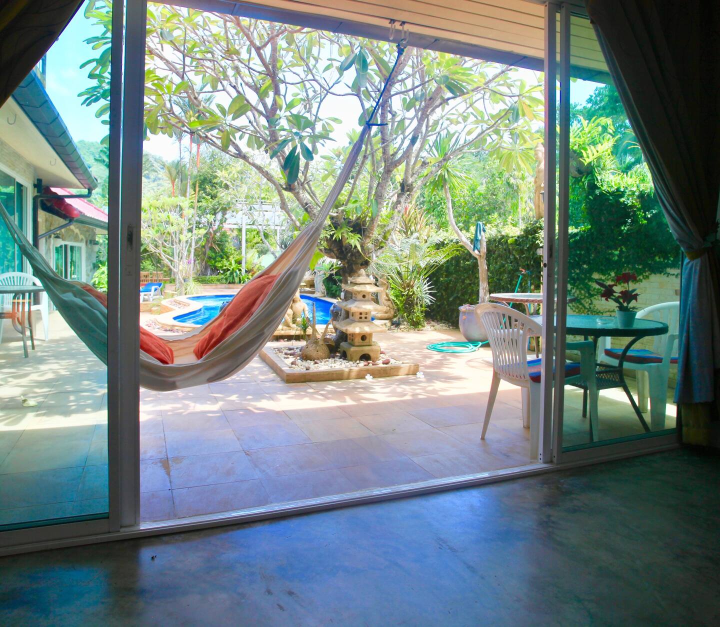 Vor der nicht einsehbaren Terrasse der Sunshine Villa lädt ein Swimming-Pool inmitten eines immergrünen tropischen Gartens zum Relaxen ein. Im Garten sind mehrere ideale Plätze für Yoga-, Meditations- und Entspannungsübungen vorhanden.